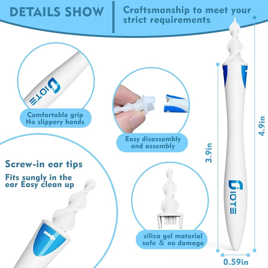 Su punta flexible de silicona se adapta suavemente a la forma natural de tu oído, permitiendo retirar la cera con un simple giro del mango. Después de usarlo, solo tienes que desechar la punta y reemplazarla por una nueva: rápido, higiénico y sin complicaciones.